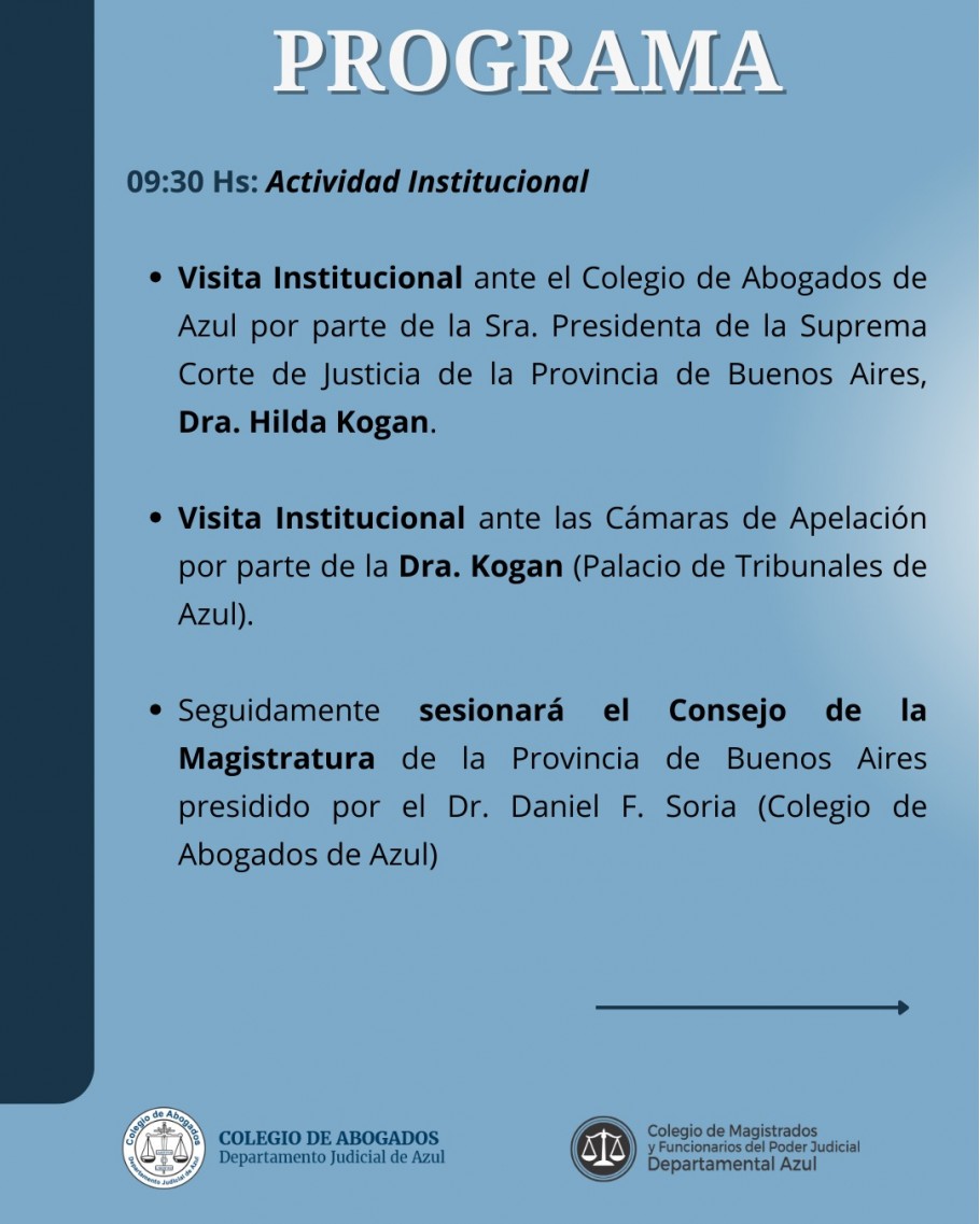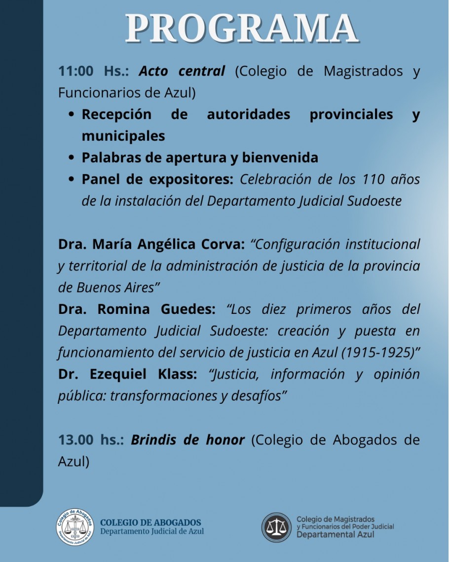 El Colegio de Magistrados y Funcionarios del Departamento Judicial Azul y el Colegio de Abogados de Azul invitan a participar de la conmemoración por los 110 años de la creación del Departamento Judicial de Azul, un hito fundamental en la historia institucional de la región y en el fortalecimiento del servicio de justicia en la provincia de Buenos Aires.