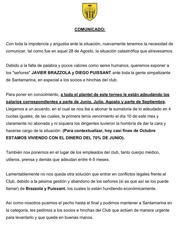 Los jugadores de Santamarina expresaron su "impotencia y angustia" ante la crítica situación económica que atraviesa el club y denunciaron una importante deuda salarial