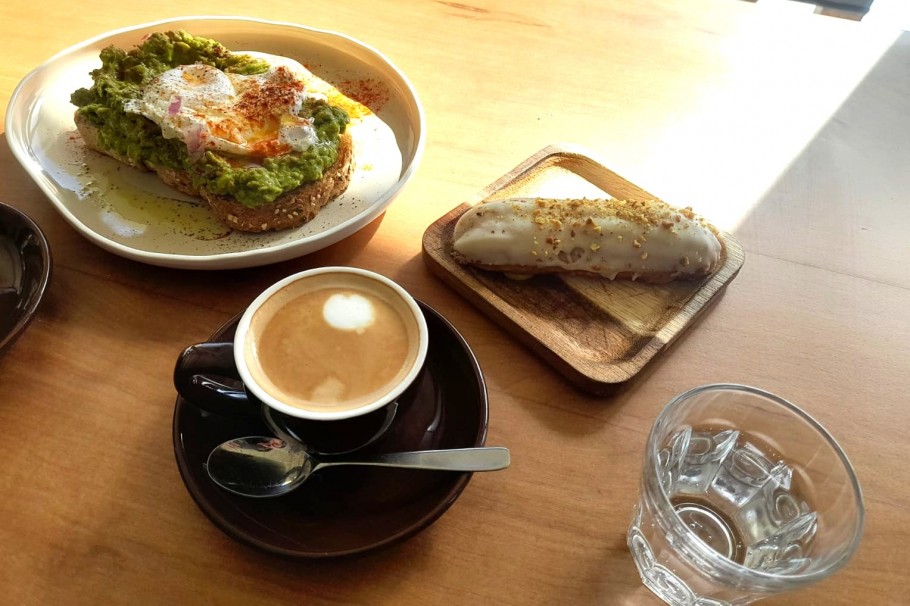 somnolientos sobre la tibia avenida, nuestra comanda llegó a la mesa: avocado toast, éclair de crema pastelera y