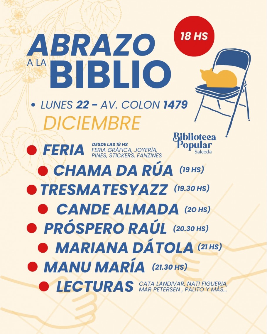 Desde la organización invitan a toda la comunidad a acercarse, acompañar y participar del Abrazo-Festival como forma de apoyo activo a la Biblioteca Popular Salceda y a su continuidad como espacio cultural de referencia.