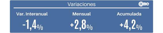 En la comparación mensual desestacionalizada, se observó un incremento de 2,8%. En lo que va del año, las ventas acumulan un aumento interanual de 4,2%.