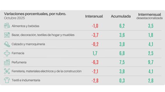 En el análisis por rubros, seis de los siete sectores mostraron caídas interanuales. El rubro "Perfumería" presentó la mayor baja (-6,3%), seguido por "Bazar, decoración, textiles para el hogar y muebles" (-3,7%). En la comparación intermensual, todos los rubros registraron incrementos. "Perfumería" lideró el crecimiento con una suba de 9,7% respecto del mes anterior, seguida por "Ferretería, materiales eléctricos y de la construcción" (+4,1%).