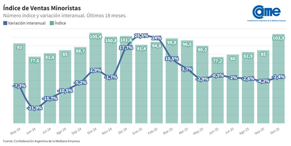 En octubre, las ventas minoristas pymes registraron una variación interanual de -1,4% a precios constantes.